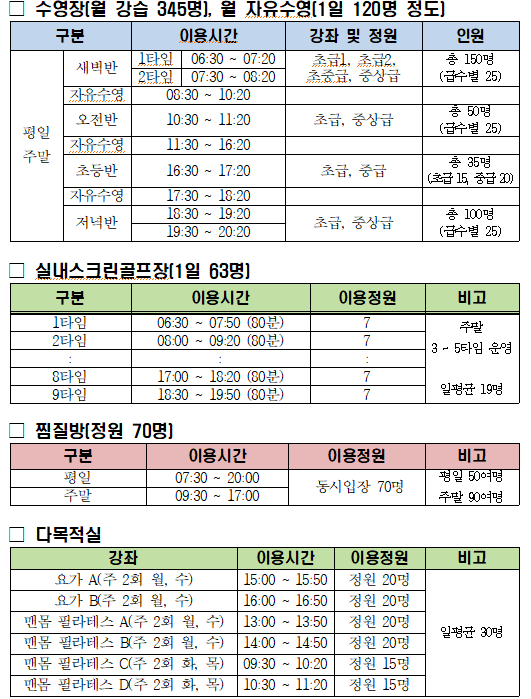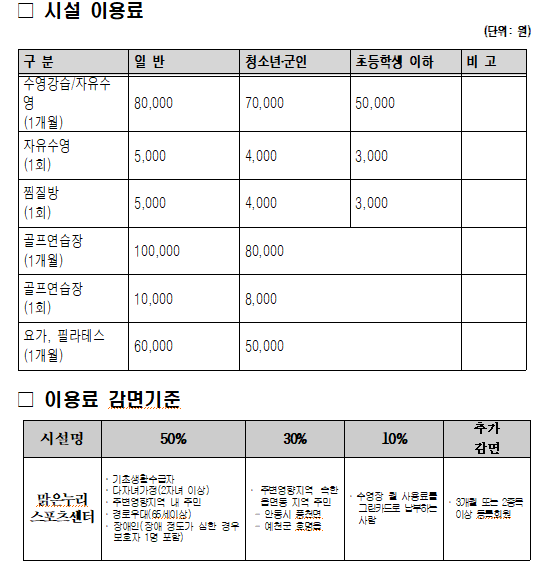 ■맑은누리 스포츠센터 이용료 및 감면기준