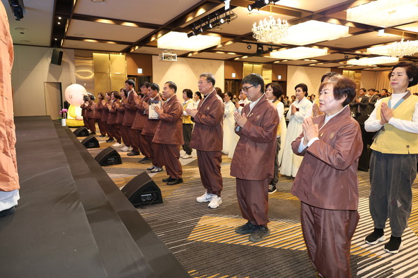 명종 5타가 울려 퍼지며 본격적인 법회가 시작됐다. 사부대중은 마음을 가다듬고 합장한 가운데, 부처님의 지혜와 자비가 온 법계에 두루 퍼지기를 발원했다.