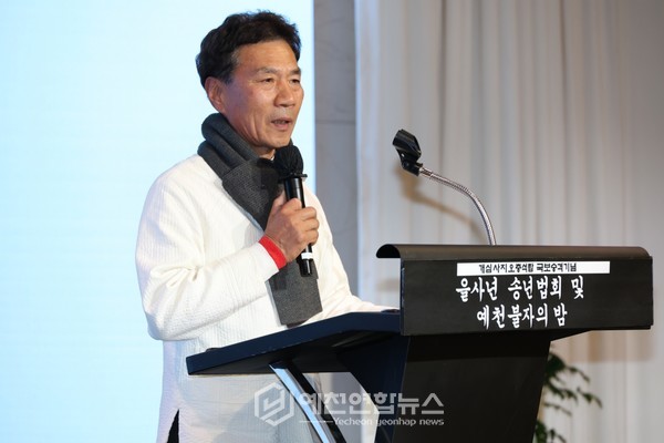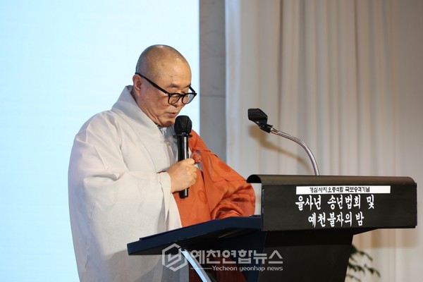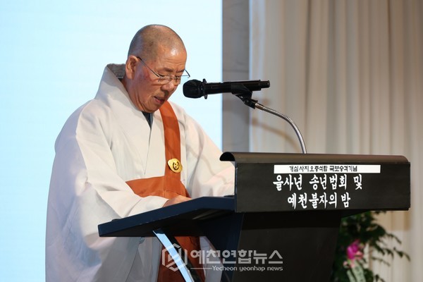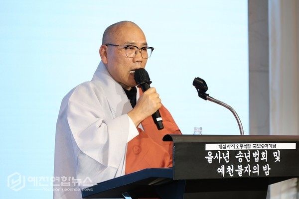 오늘 예천개심사지 오층 석탑의 국보 지정을 기념하고 한 해의 정진을 회향하는 자리에 함께하게 되어 기쁨과 감사를 올린다. 우리 예천의 뿌리 깊은 불심 속에서 천년 고탑이 마침내 국보로 인정 받은 것은 지역 불교의 역사와 전통, 수행과 원력이 세상에 다시 빛을 드러낸 뜻깊은 결실이다. 이제 우리는 국보의 영광을 넘어 예천불교가 미래 세대와 지역 사회에 더 큰 희망과 자비의 등불이 되도록 더욱 굳건히 서원하고 나아가야 한다.고 했다.