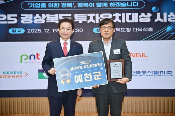 예천군은 19일, 경북도청에서 개최된 ‘2025년 경상북도 투자유치대상’ 시상식에서 시·군 자치단체 부문 장려상을 수상했다.