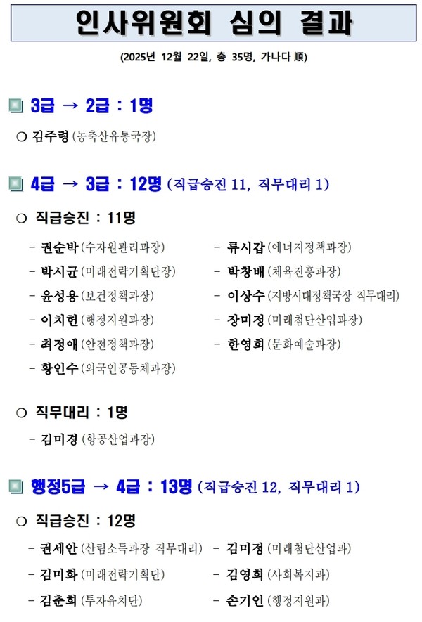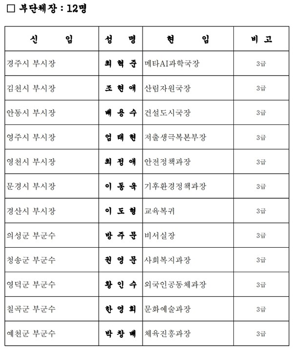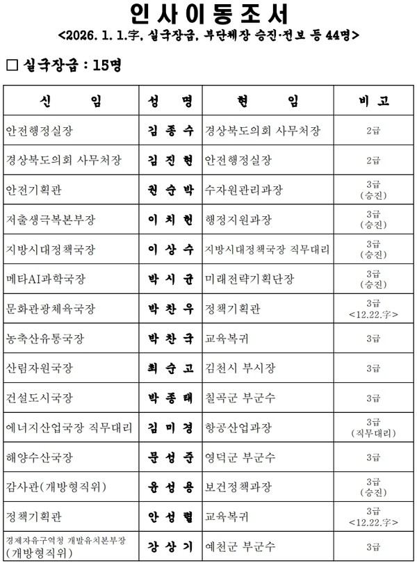 경상북도는 1월 1일 자로 능력과 성과를 중심으로 한 2026년 상반기 실·국장, 부단체장, 4급 이상 승진 인사를 단행했다.