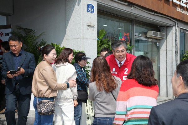 선거사무소 2층 행사장은 시작 전부터 빈자리를 찾기 어려울 만큼 가득 찼고, 계단과 건물 밖 도로변까지 참석자들이 길게 늘어서며 개소식 열기를 보여줬다.