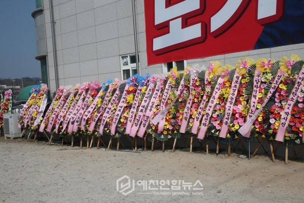 행사장 내부에 들어오지 못한 군민들이 계속 늘어나자 도 예비후보 측은 본 행사에 앞서 1층에서 식전 테이프 커팅식을 별도로 진행했다.